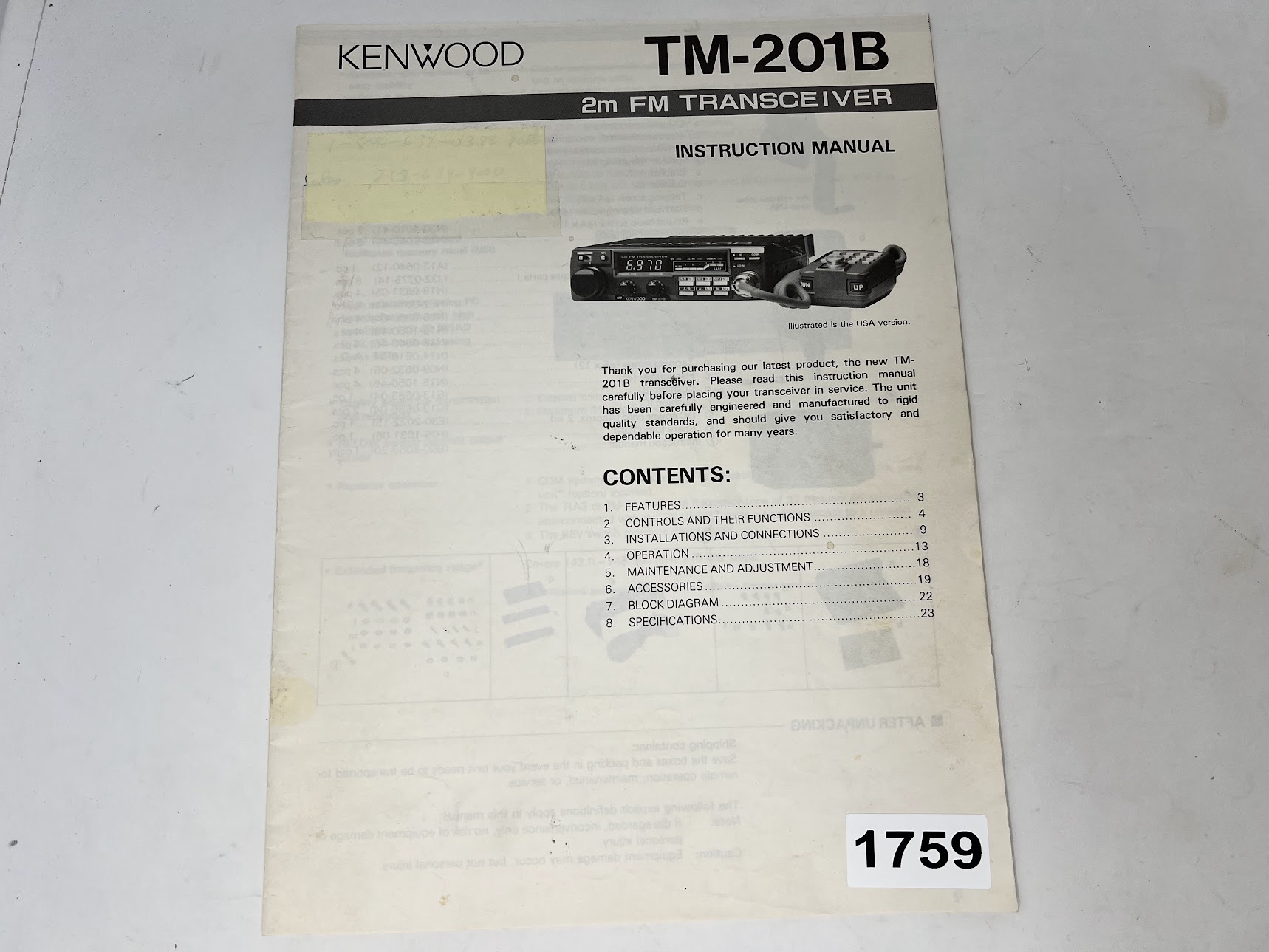 KENWOOD Instruction Manual for TM-201B FM Transceiver