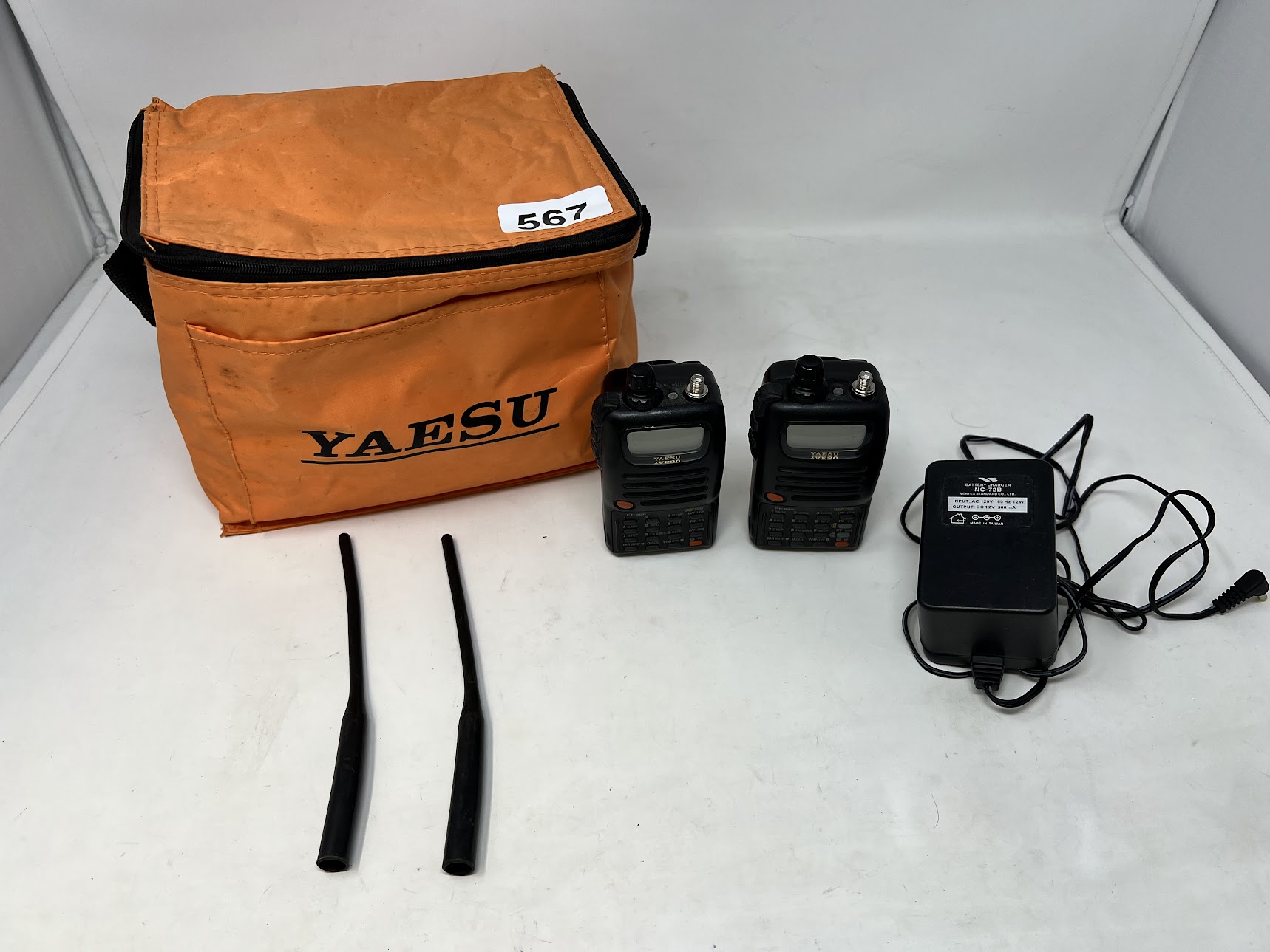 Includes: NC-72B Charger, Yaesu Carry Bag, 2 Hand Helds, & 2 Antennas (will need new batteries)